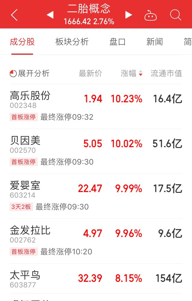 受消息影响,19日,二胎概念走强,截至午间收盘,包括高乐股份、贝因美、爱婴室、金发拉比在内的多股涨停。太平鸟涨幅超过8%,睿智医药、奥飞娱乐涨幅超过7%。