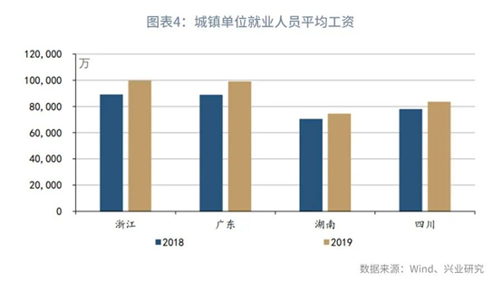 劳动力外出的减少引起了三方面的变化。第一,考虑到劳动力输出地的收入和消费水平通常低于劳动力输入地,就近就业可能导致劳动力的收入和消费水平均出现下降。2019年浙江和广东的城镇单位就业人员年平均工资均在9.5万以上,但是湖南和四川的城镇单位就业人员年平均工资都在8.5万以下。此外,就近就业还减少了劳动力租房和外出就餐等方面的支出。
