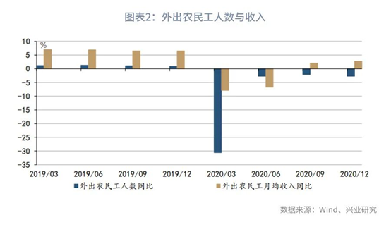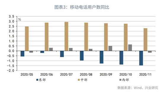 从外出劳动力的角度来看,疫情降低了劳动力外出就业的意愿,使更多劳动力就近就业,进而带来其收入总量与消费水平的下降。 我国有大量的异地就业人口。2019年,我国的流动人口总量为2.4亿,人户分离人口更高达2.8亿。然而,疫情爆发后,更多劳动力选择了就近就业。一方面,2020年四个季度外出农民工人数同比降幅均在2.0%以上。虽然2020年下半年外出农民工收入同比正增长,但并未吸引更多的农民工外出就业。另一方面,2020年5月至11月(1至4月数据缺失),东部移动电话用户数同比持续负增长,中部地区移动电话用户数持续正增长,而在此期间的7个月内,西部地区的移动电话用户数有5个月是正增长的。这也表明,作为重要劳动力输出地的中西部地区的常住人口可能在上升,而作为劳动力输入地的东部地区的常住人口可能有所减少。