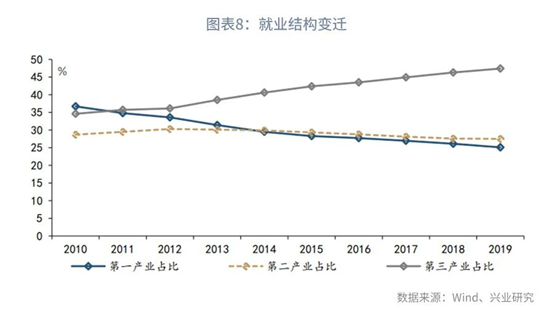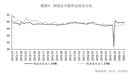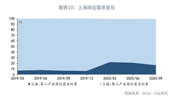 从就业结构的角度来看,疫情使制造业和服务业的就业情况出现分化,因此,虽然2020年第四季度GDP增速已经超过了疫情爆发前的水平,服务业从业人员的收入和消费增速依然受到抑制 。第三产业是吸收就业的主力。 2019年第三产业就业人员占比为47.4%,显著高于第二产业的27.5%。然而,疫情对服务业的影响远高于制造业。2020年3月以来制造业从业人员PMI显著高于服务业从业人员PMI。以上海为例,2019年第四季度上海第三产业岗位需求比重达到93.8%,但2020年第三季度这一比重仅为83.1%。