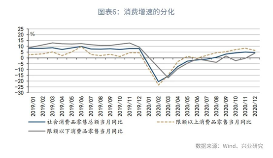第三,劳动力输入地的常住人口中外来劳动力的比例下降,导致消费数据出现结构性的变化。 一方面,限额以上消费增速已经恢复到疫情爆发前的水平,但限额以下消费迟迟难以恢复。2020年第四季度限额以上消费品零售增速平均为7.3%,但限额以下消费的同比增速平均为0.5%。