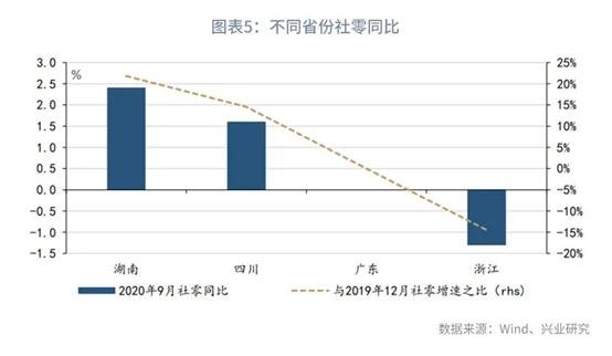 第二,流动人口的减少导致劳动力输出地的消费总量恢复更快,而劳动力输入地的消费总量恢复更慢。 由于省级月度社会消费品零售数据不完整,这里仅选取广东和浙江为劳动力输入地的代表,湖南和四川为劳动力输出地的代表。数据显示,2020年9月广东和浙江的社会消费品零售总额当月同比分别为0.0%和-1.3%,而同期湖南和四川的社零同比均实现了正增长,分别为2.4%和1.6%。