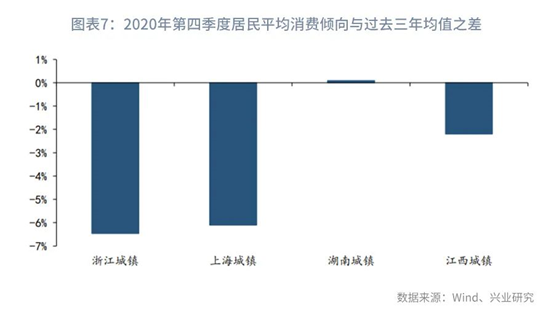 另一方面,由于边际消费倾向随收入的增加而下降,外来劳动力减少或使劳动力输入地的平均消费倾向下降更快。考虑到分省的居民收支数据不完整,这里以浙江和上海为劳动力输入地的代表,以湖南和江西为劳动力输出地的代表。数据显示,2020年第四季度浙江和上海的城镇居民平均消费倾向均较过去三年均值下降了6.0个百分点以上,但江西城镇居民平均消费倾向仅较过去三年均值低2.2个百分点,湖南城镇居民的平均消费倾向甚至较过去三年均值还提高了0.1个百分点。