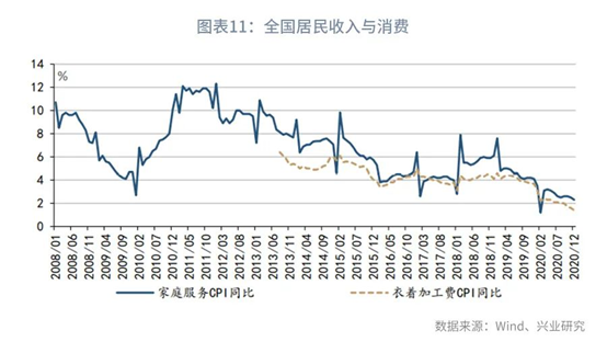虽然第二产业的就业形势较好,部分制造业企业甚至出现了“用工荒”,但第二产业吸纳就业的能力有限,难以完全对冲服务业就业放缓的影响。这可能抑制了服务业工资的增长。数据显示,主要由服务业劳动力成本构成的家庭服务价格和衣着加工价格同比均处于2008年以来的低位。