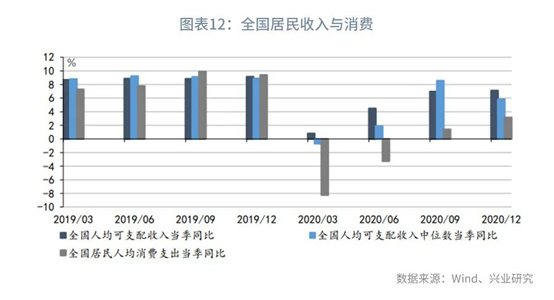 因此,虽然2020年第四季度GDP同比增速超过了疫情爆发前的水平,但同期全国居民人均可支配收入中位数同比仅增长5.8%,较2019年第四季度低3.0个百分点。
