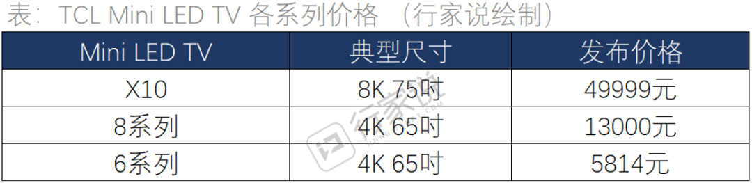 TCL算是最早开始研发量产Mini LED的代表,于2019年即推出全球首台Mini LED TV X10系列,此后陆续推出8系列、6系列Mini LED TV,并于2021年推出了搭载第三代Mini LED显示技术的OD Zero电视,后者暂未公布售价。前面三款系列价格分别为(部分用外币发布按汇率折合成人民币):