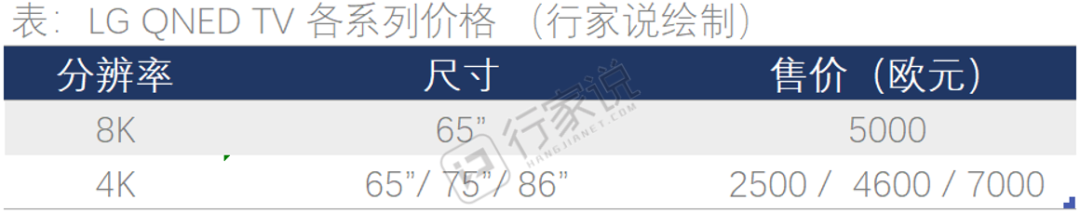 在CES 2021上,LG展出了此前发布的首款Mini LED背光电视QNED TV。该系列电视含4K、8K型号。价格上,LG 65英寸4K QNED电视的售价为2500欧元(约19565元),75英寸4K型号电视的价格为4600欧元(约35999元),86英寸4K型号的价格为7000欧元(约54782元)。8K的要更贵一点,LG 65英寸8K QNED电视起价为5000欧元(约39130元)。据报道,LG QNED电视将于今年5月至7月推出。