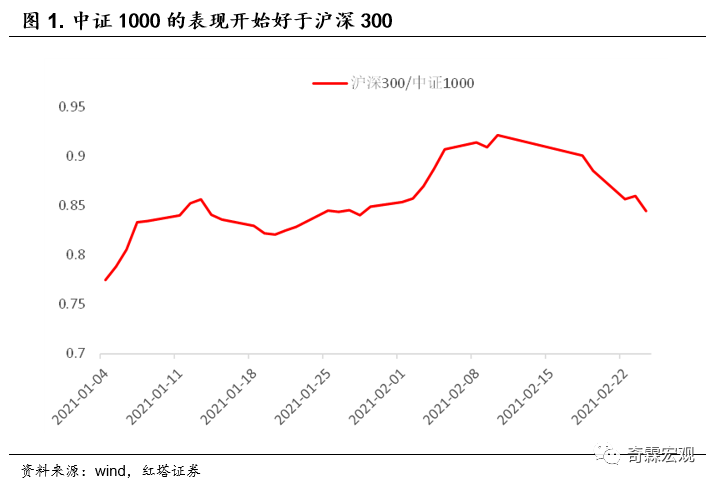 今年春节前的交易日,市场还在抱团核心资产,所以我们能看到沪深300的涨幅显著好于中证1000,但春节后,就反过来了,中证1000的表现要显著好于沪深300。