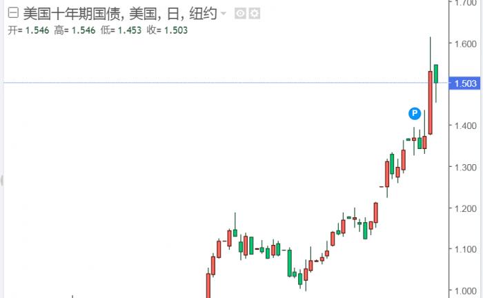 该来的还是来了,全球风险资产定价锚——美国10年期国债收益率隔夜飙升,一度突破1.6%,最高触及1.614%,刷新近一年的高点。春节以来,该收益率大幅攀升超过20%,甚至已经超越去年2月末新冠肺炎疫情开始引爆金融市场大暴跌的水平。