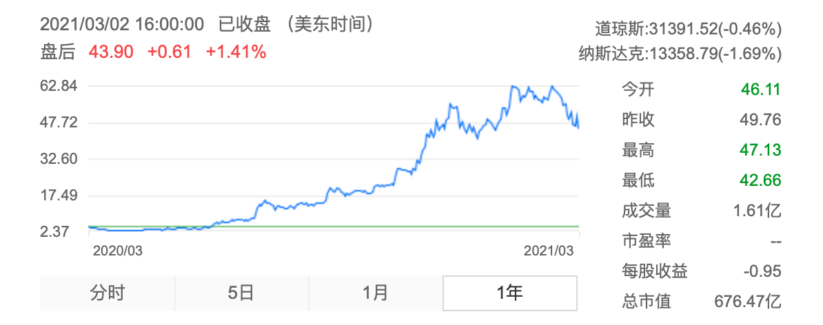 可见,作为中国三家汽车新势力中起步最早,销量最高的公司,市场对蔚来汽车寄予厚望,但昨天蔚来汽车公布的2020年Q4及全年财报中来看,在第四季度,虽然毛利率提升至17.2%,创历史新高,但净亏损环比扩大32.6%,同比收窄51.5%,并没有达到市场预期。随后,在近期美股持续动荡的背景下,美东时间3月2日蔚来股价收盘价43.29美元,大跌-13.00%,市值676.47亿美元。