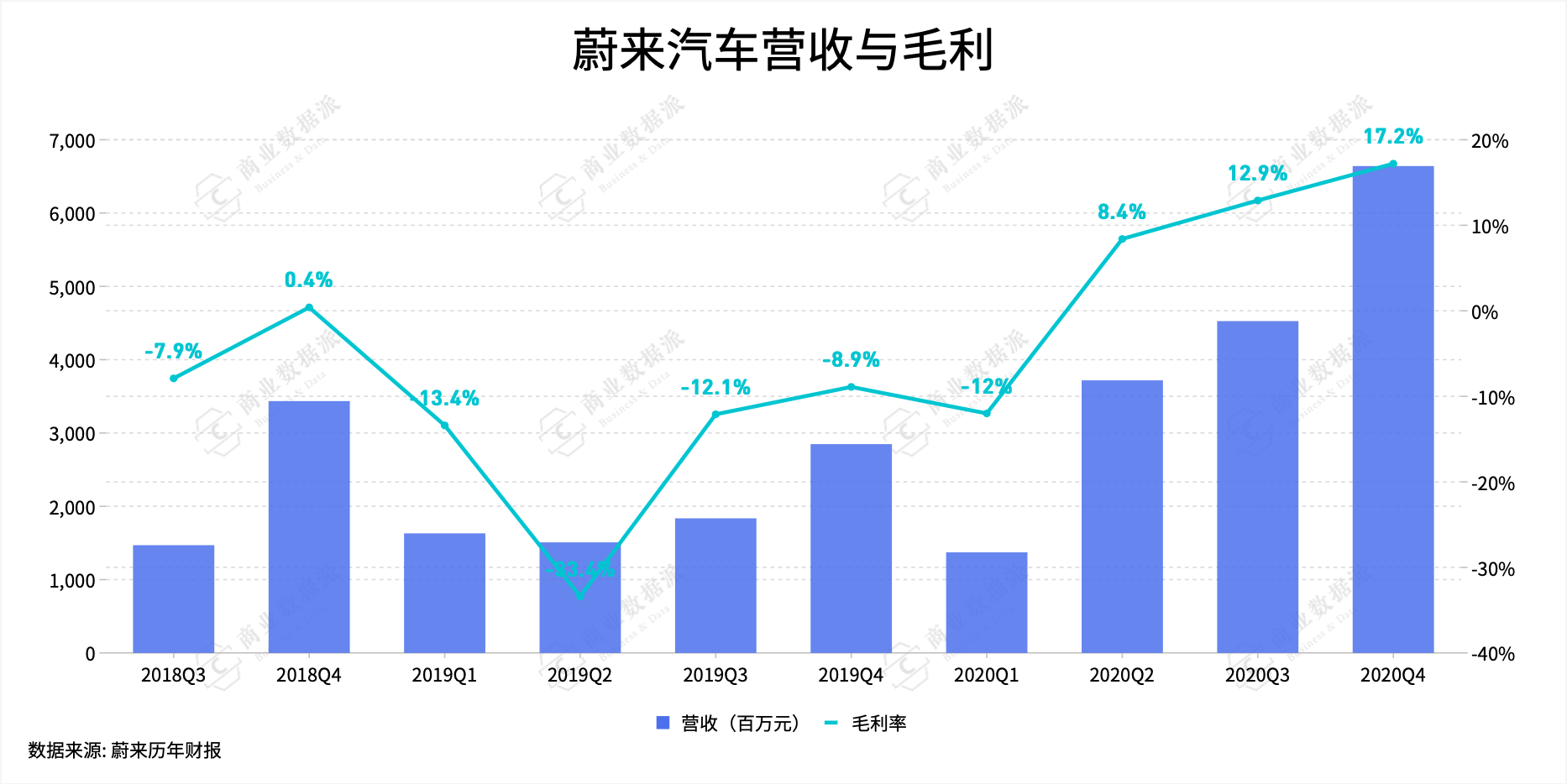 蔚来汽车第四季度综合毛利率17.2%,第三季度则为14.5%,相比之下2019年第四季度为-6.0%,毛利率整体向好。