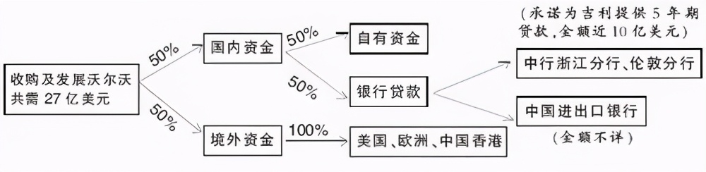 吉利与福特签订正式收购协议后,吉利集团副总裁、首席财务官尹大庆表示,收购沃尔沃的价格为18亿美元,但加上后续发展需要的流动资金,共需要27亿美元资金。其中一半来自于国内,另外一半则是国外的资金。