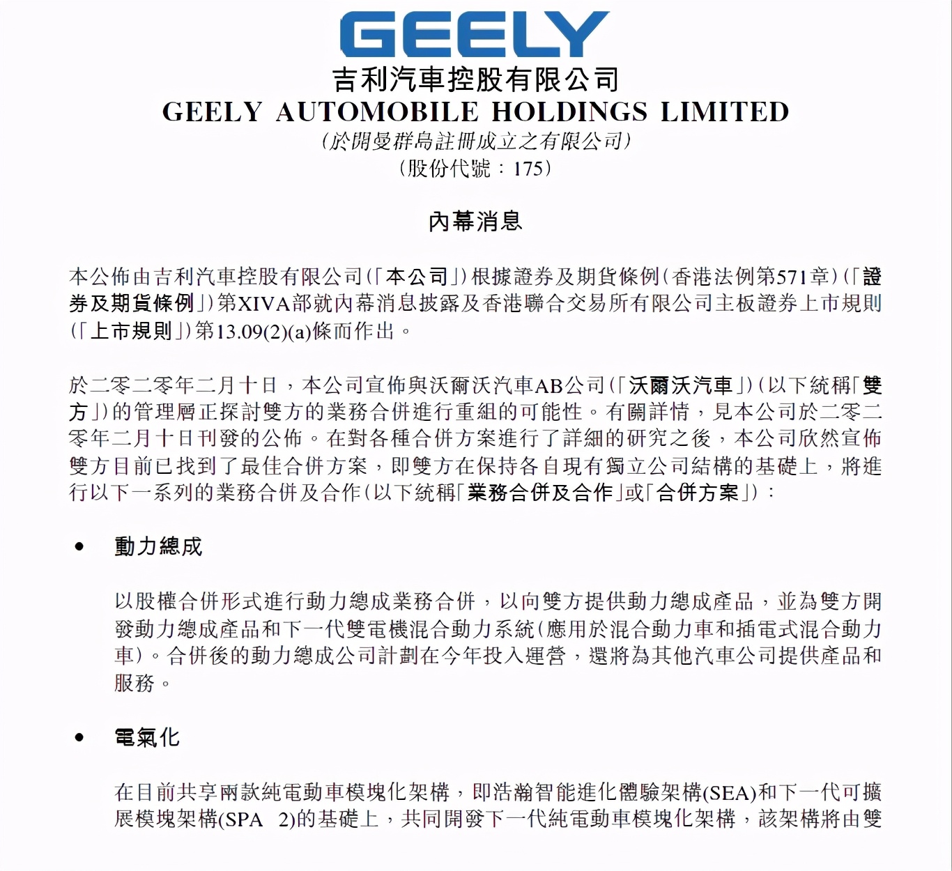2月24日,吉利汽车(00175.HK)发布公告称,已与沃尔沃汽车有限公司(以下简称沃尔沃汽车)达成最佳合并方案。