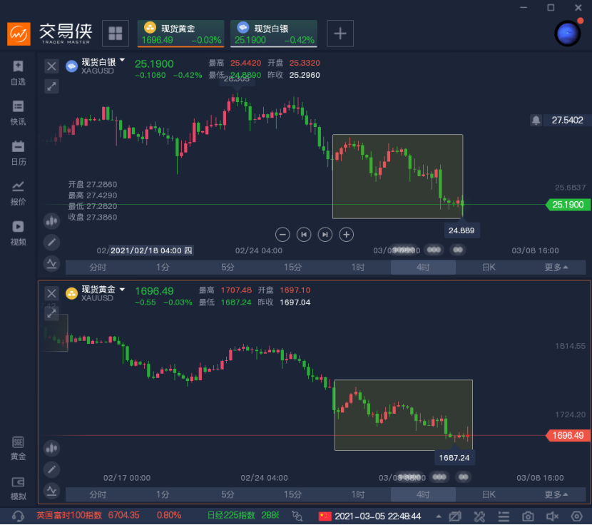 美债收益率的攀升冲击了金银市场,因持有的机会成本增加,现货金银遭遇抛售,双双震荡走低,黄金周四凌晨跌破1700关口,刷新9个月新低,本周振幅超60美元;白银也一度痛失25美元关口,周线势将摘下一根大阴线。