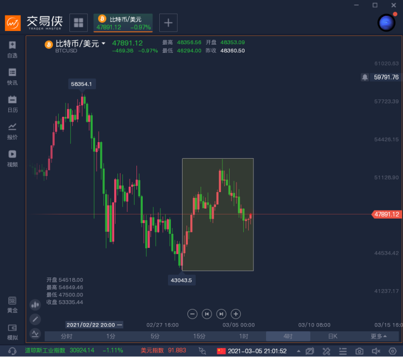 比特币本周先涨后跌。本周前几日自发力猛攻,一度自周内低位暴拉超9000美元,不过后半周反弹乏力,截至发稿回踩48000美元关口附近。