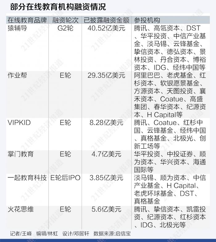 21世纪经济报道记者选取猿辅导、作业帮、VIPKID、掌门教育、一起教育科技、火花思维6家头部在线教育公司,据启信宝数据显示,这6家公司成立以来已融资超过92亿美元,吸引了众多国内外知名的投资机构。