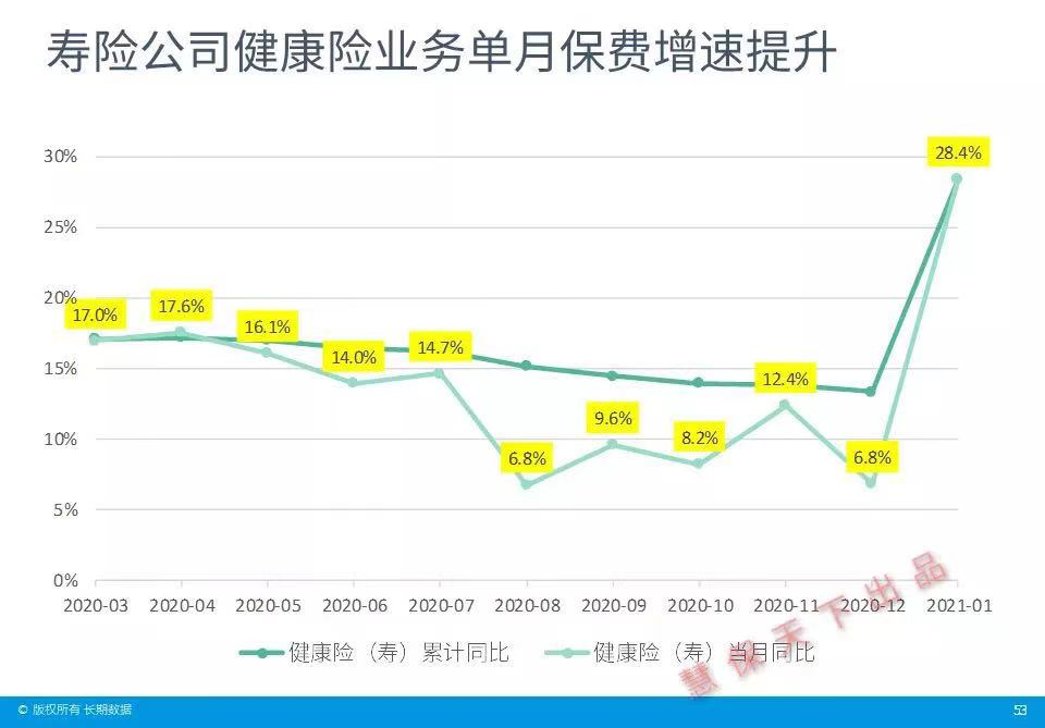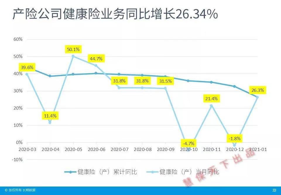 数据显示,2021年1月,保险业整体实现原保险保费收入10093.69亿元,同比增长11.16%。就大类险种而言,健康险当之无愧成为行业增速最快的险种之一: