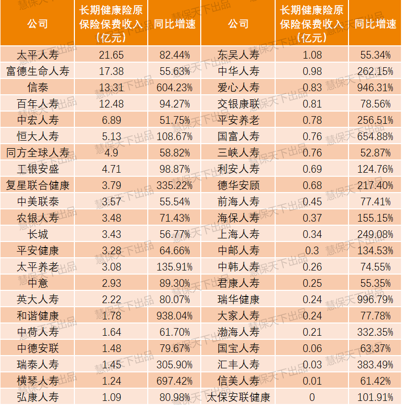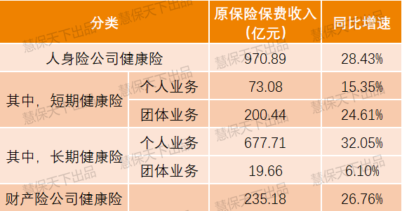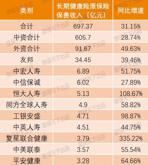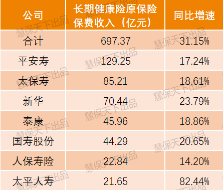 从人身险公司来看,在不区分个人业务、团体业务的情况下,长期健康险实现原保险保费收入697.37亿元,同比增速31.15%。