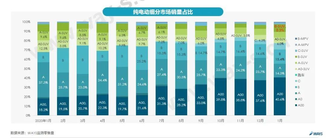 1月,纯电动各细分市场份额基本保持稳定,B级SUV市场份额在元旦新上市国产MODEL Y销量带动下环比增长4.1%。