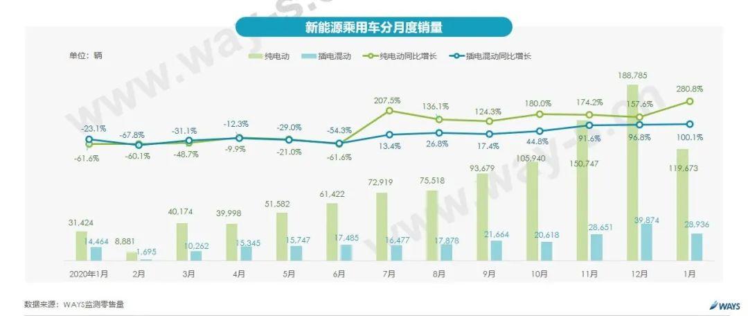 1月,新能源市场销量约为14.9万辆,环比下降35.0%,同比增长223.9%;纯电动销量约12.0万辆,环比下降36.6%;插电混动销量约2.9万辆,环比下降27.4%。