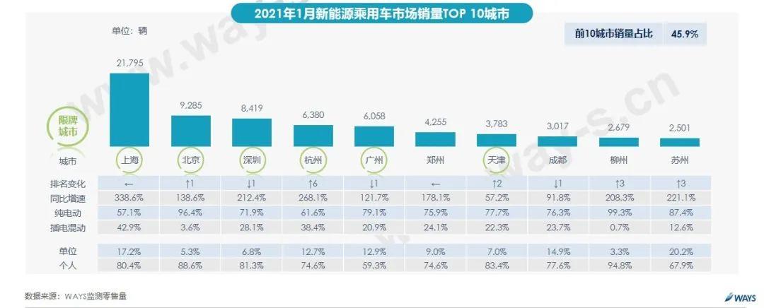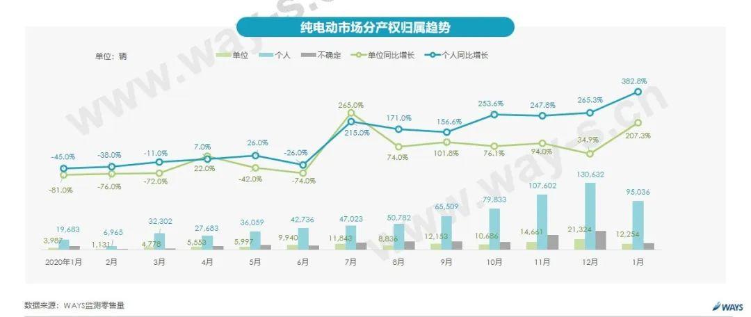 1月,纯电动市场个人用户占比为79.4%;同比去年,单位用户销量增长207.3%,个人用户增长382.8%。