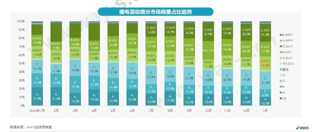 1月,插电混动A级SUV市场份额有所提升,主要由荣威RX5 ePLUS、MG领航PHEV带动,环比增长4.7%。