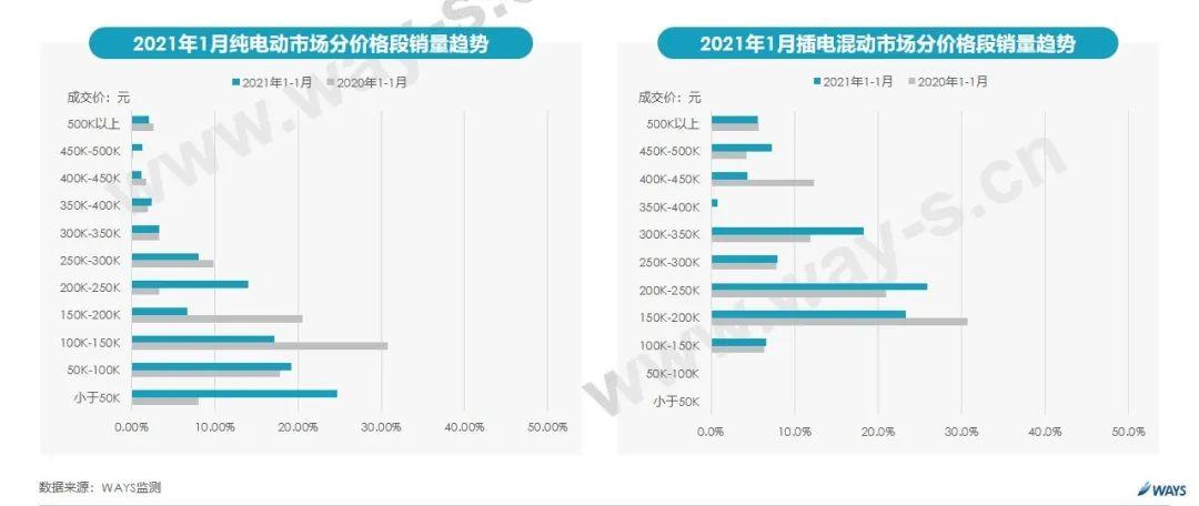 纯电动市场成交价5万元以下、20-25万元区间的车型销量远高去年同期,且销量重心位于5万元以下区间。