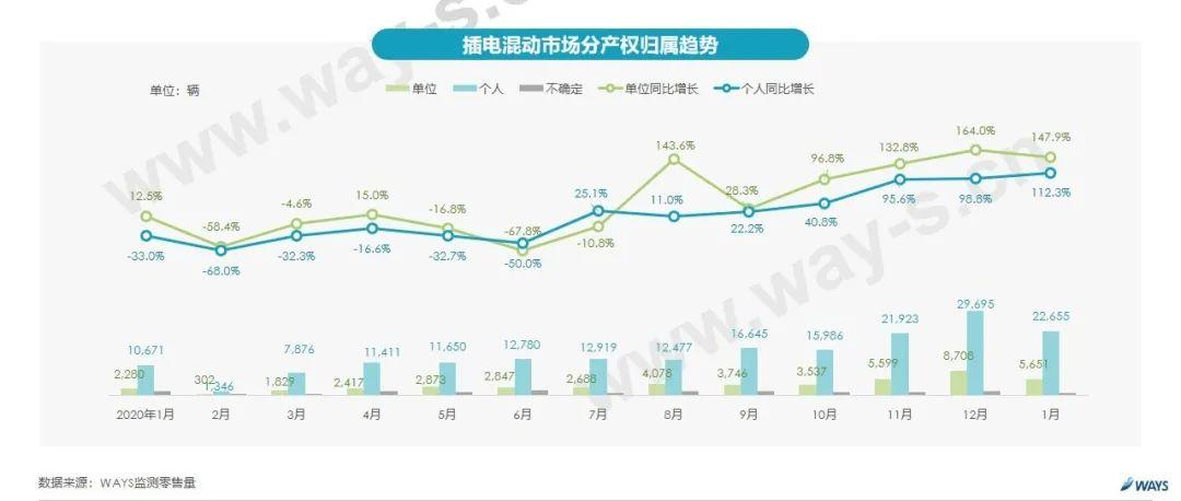1月,插电混动市场以个人用户为主,占比78.3%,销量同比增长112.3%;单位用户销量同比去年增长147.9%。
