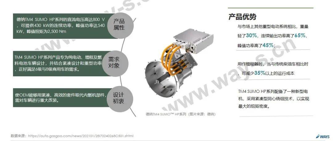 1月26日,外媒报道德纳(Dana Incorporated)宣布推出德纳TM4 SUMO HP电机与逆变器扩展系列产品,该系列产品为纯电动、增程及燃料电池车辆设计。目前,原始设备制造商(OEM)正对此类技术进行测试,计划将于2021年上半年投入量产。