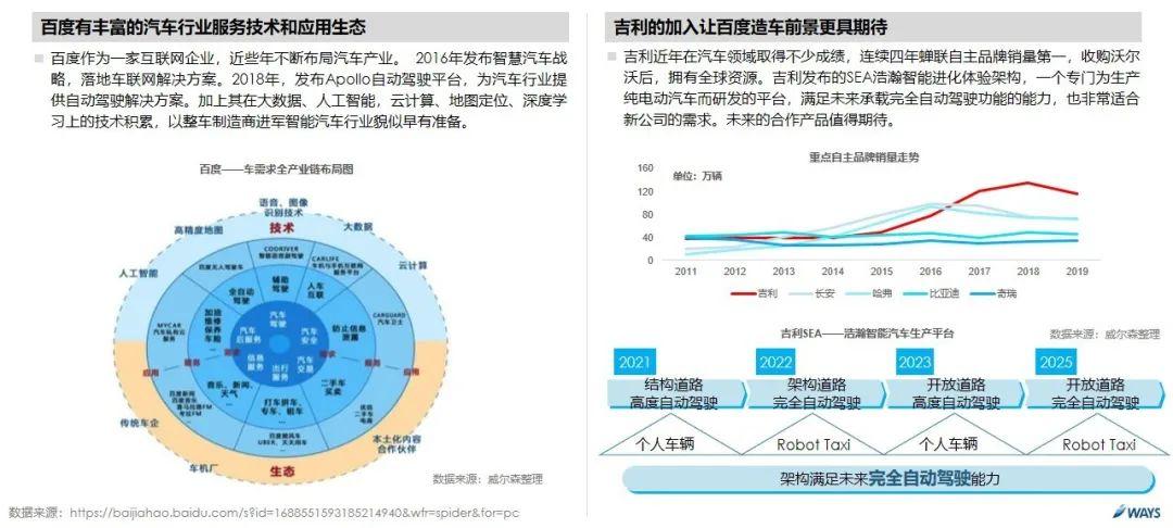 1月11日,百度宣布与吉利控股集团共同组建智能电动汽车公司,吉利控股集团成为百度电动汽车公司的战略合作伙伴。寄希望依托双方的经验和技术优势来重塑下一代智能汽车产品形态。
