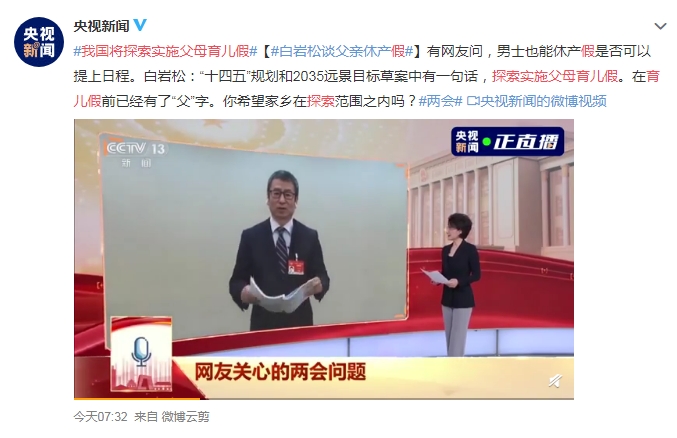 有网友问,男士也能休产假是否可以提上日程?白岩松说:“十四五”规划和2035远景目标草案中有一句话,探索实施父母育儿假。在育儿假前已经有了“父”字。