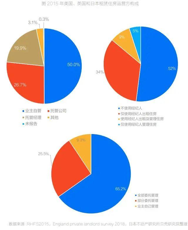 日本的个人业主拥有的租赁住宅当中,大约65.2%的住宅由业主完全托管给管理机构运营,租赁房源的前期装修改造费用多由产权持有者承担,机构无需承担;25.5%的住宅属于部分委托管理,管理机构主要负责招租工作,部分住宅也负责一些资产管理工作,如代收取房租之类,其他管理工作则由业主负责;另外9.3%的租赁住房完全由房东负责管理,包括招租和租后管理工作。民营租赁中其他15%的租赁房屋由法人所有实际上也是机构化租赁。