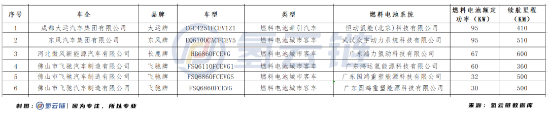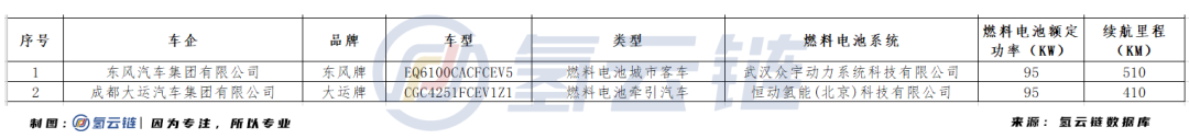 上榜的两款车型分别为东风汽车与大运汽车,分别由众宇动力、恒动氢能配套;燃料电池系统额定功率均为95kw,续航里程分别为510公里与110公里。
