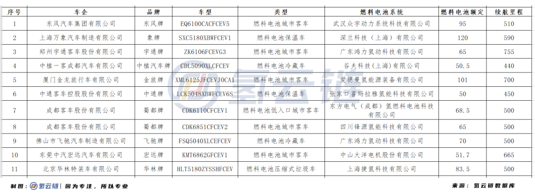 氢云链了解到,第341批《新能源汽车推荐目录》的11款燃料电池商用车中,燃料电池客车6款,燃料电池保温车、燃料电池冷藏车均为2款,燃料电池压缩式垃圾车有1款上榜。