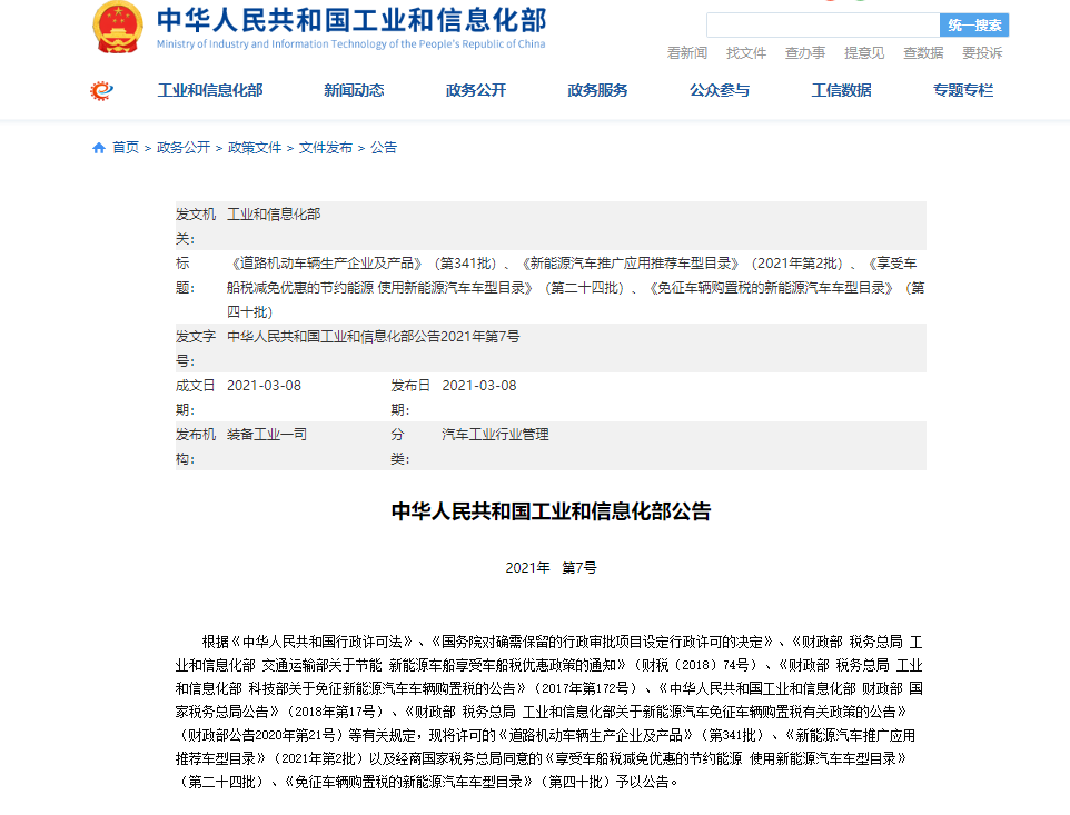 3月8日,工信部集中公告了《道路机动车辆生产企业及产品》(第341批)、《新能源汽车推广应用推荐车型目录》(2021年第2批)以及经商国家税务总局同意的《享受车船税减免优惠的节约能源 使用新能源汽车车型目录》(第二十四批)、《免征车辆购置税的新能源汽车车型目录》(第四十批)予以公告。