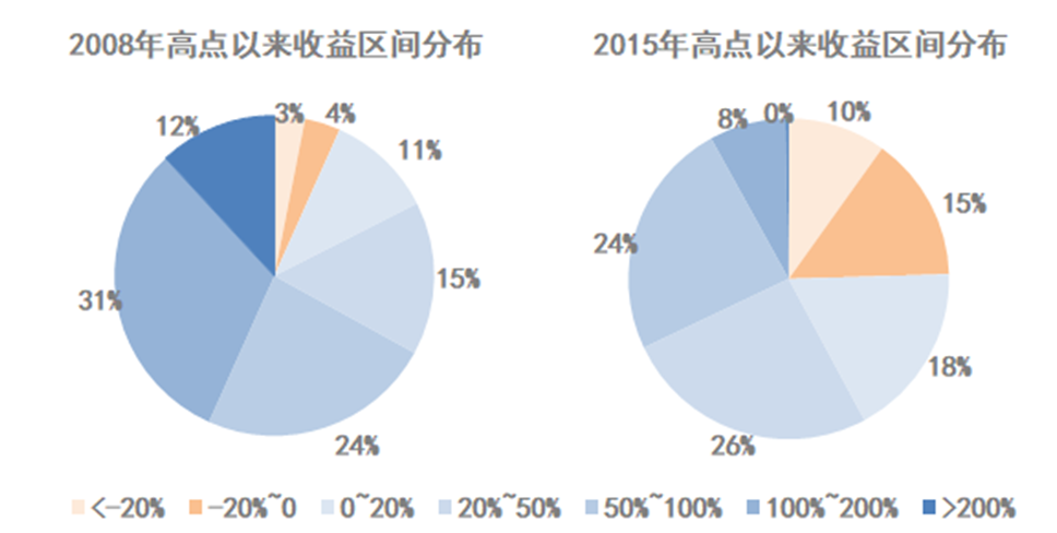 根据统计,主动偏股型基金2008年高点以来取得正收益的比例为93%,平均收益率97%;2015年高点以来取得正收益的比例为75%,平均收益率为33%。