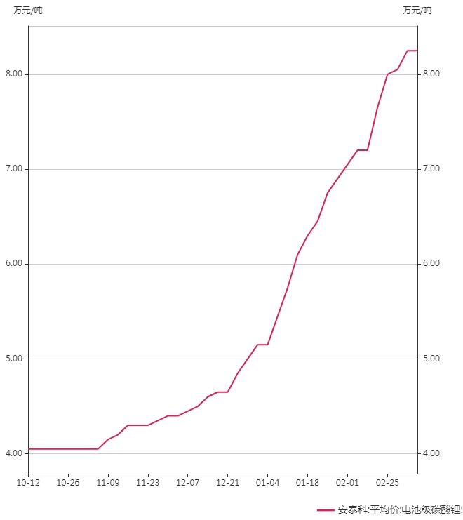 安泰科数据显示,截至3月10日,国内电池级碳酸锂均价为8.25万元/吨,较上月同期上涨15%。