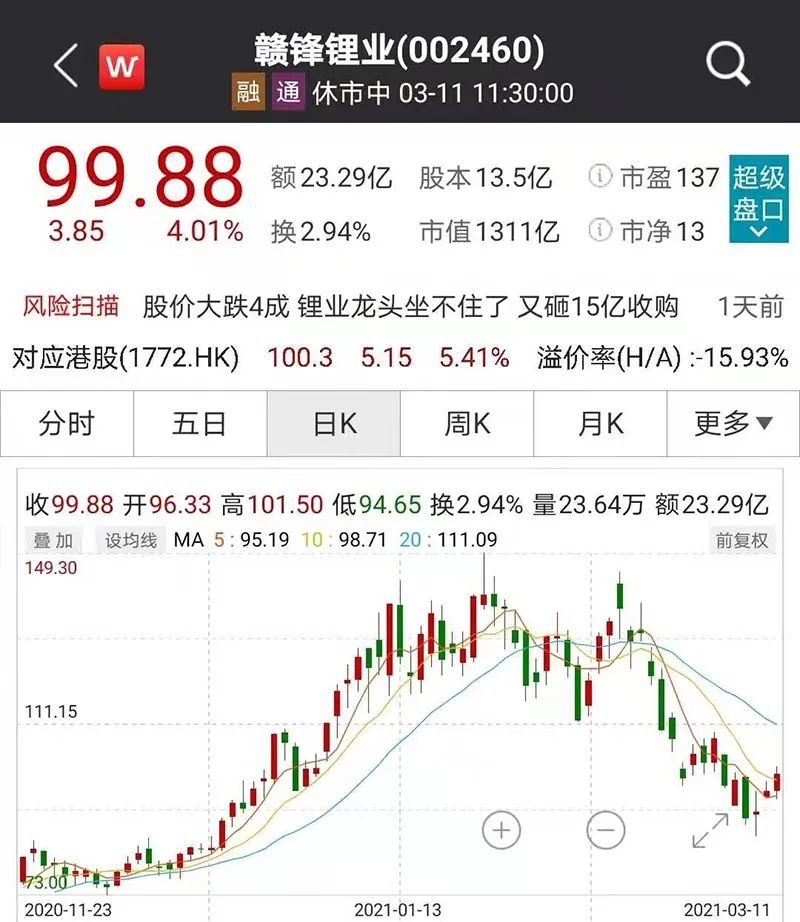 虽然锂价不断攀升,相应概念股的走势却令人气馁。以行业龙头赣锋锂业为例,截至11日中午收盘,该股自2月以来已累计下跌超18%。