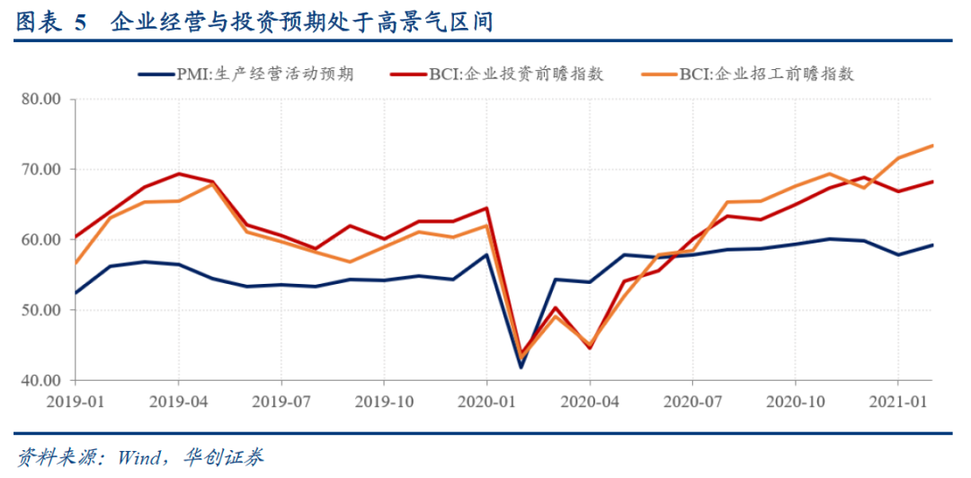 企业方面,经济持续修复,全球贸易向好的背景下,企业对于未来经营、投资的预期都比较乐观,因此融资意愿也很积极。PMI生产经营活动预期指数、BDI企业投资指数、BDI企业招工指数来看处于高景气区间。根据统计局解读“部分调查企业反映,3月份将进入产销旺季,市场需求有望回升,企业对节后行业发展信心增强。……企业对近期服务业市场发展前景较为乐观。……近期建筑业市场需求有所增加,行业发展预期向好。……”
