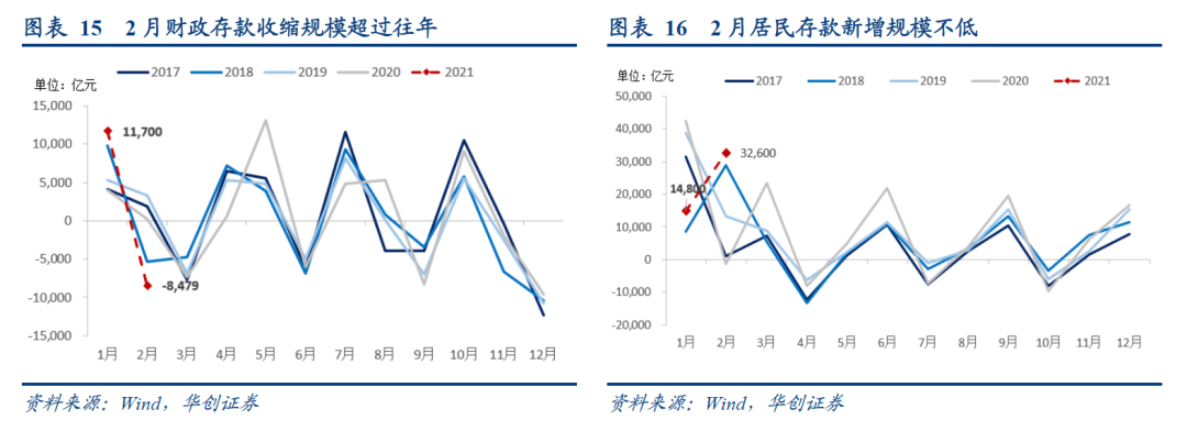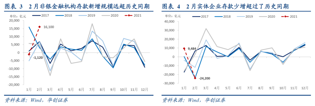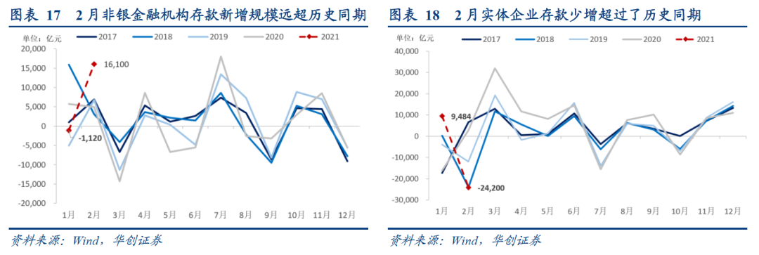 但季节性因素不足以完全解释M1的下行,综合1-2月来看,M1同比收缩的幅度也是远超出历史同期的。额外的,我们认为消费场景的制约和金融市场的火热也可能分流了M1。今年春节就地过年,居民消费受限,减少了一部分居民现金流回补企业。同时年前股市火、基金热,开年企业及居民购买理财和基金规模较高,分流了部分资金。这与2月非银金融机构存款远超季节性的高增基本可以对应。