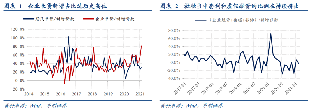 其次,结构上也是超预期的好。2月企业长贷新增占比81%,为历史以来最高值。另外,2020年下半年来社融当中企业短贷+票据+影子银行的占比基本被压制在负区间,意味着套利和虚假融资在持续的挤出。居民长贷虽然同比多增,但从新增占比看,自去年四季度以来占比被持续压制在30%左右。