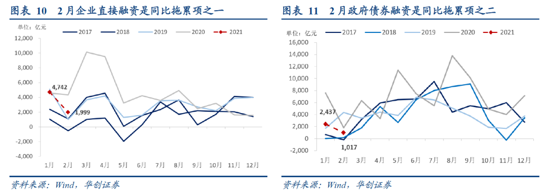 但最终结果看,1)虽然是春节月,但是信贷延续了超高新增规模。对实体投放贷款1.34万亿,同比多增约6200亿,同比涨幅达86%。企业中长贷新增规模同比接近翻番。实际上自开年以来,新增企业中长期贷款较历史同期都要高出一个量级。2)虽然监管有意控制按揭贷款,但鉴于房地产市场火爆,效果有限。居民新增长贷依然是近年同期最高,只是同比差距较1月收窄。3)企业直接融资和政府债券融资规模也超出高频数据的反馈。
