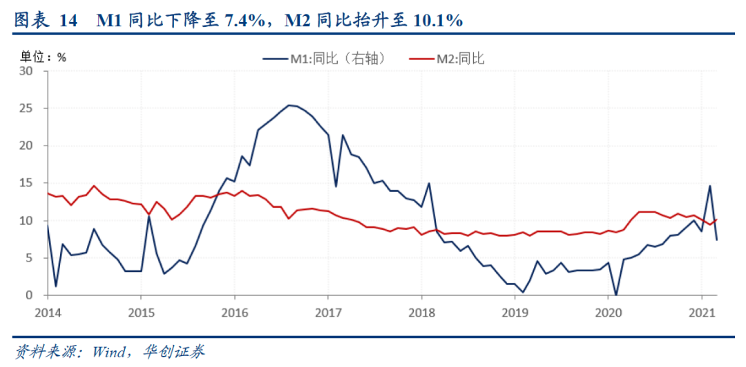 2月M2同比反弹至10.1%,M1同比快速下行至7.4%。M2同比反弹,主因财政资金2月加速投放,补充了实体流动性。M1同比快速下行,我们推测背后可能有多重原因:一是春节错位的季节性因素。春节期间,企业有集中结款和发放奖金的行为,因此往往M1春节月规模收缩。2020年春节在1月,2021年春节在2月,导致了M1上月的高企和本月的低落。二是消费场景的制约。今年春节就地过年,居民消费受限,春运客流量同比下降接近50%。三是金融市场的分流,年前股市火、基金热,开年企业及居民购买理财和基金规模较高,分流了部分资金。