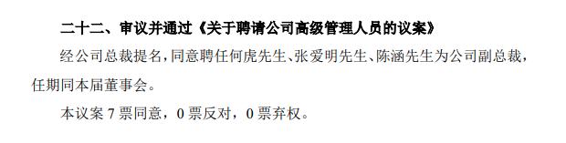 值得关注的是,在同一天披露的《迪马股份第七届董事会第二十二次会议决议公告》中,有一项议案关于公司高管人员的聘请:经公司总裁提名,同意聘任何虎、张爱明、陈涵为公司副总裁。