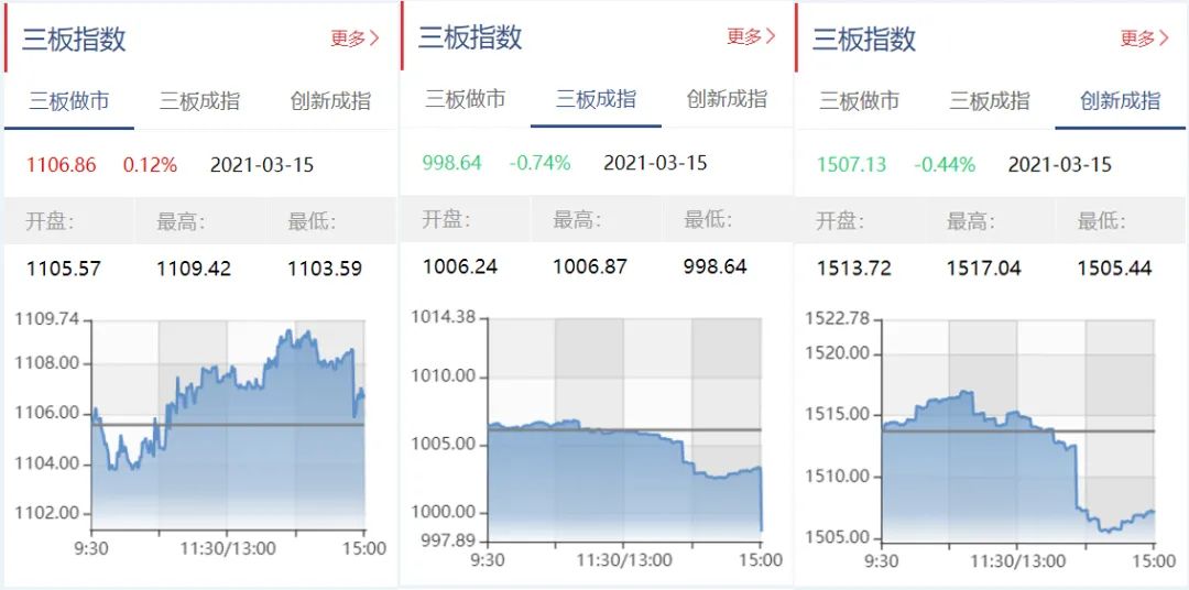 截至3月12日收盘,三板做市报1106.86点,上涨0.12%;三板成指报998.64点,下跌0.74%;三板创新成指报1507.13点,下跌0.44%。