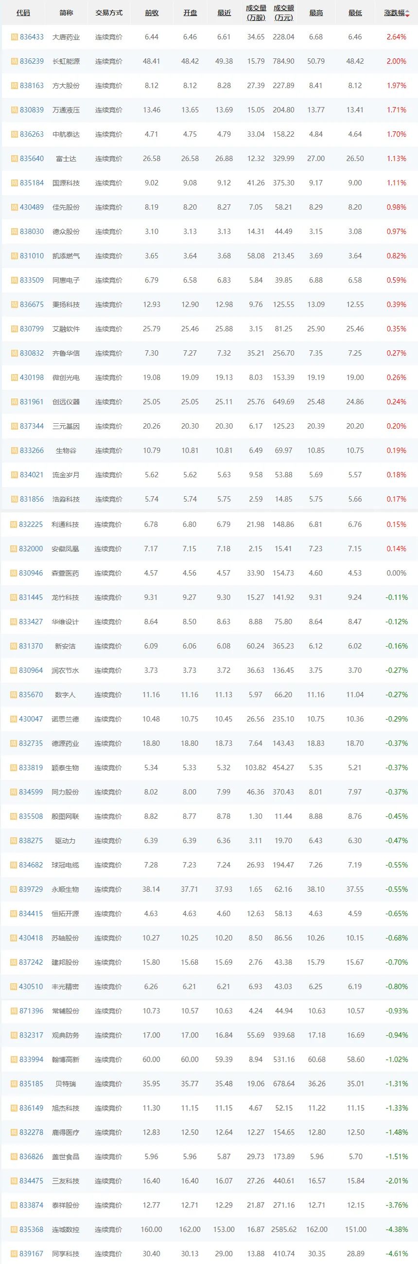 3月15日,精选层普涨,28家企业上涨,1家平盘,22家下跌。其中,大唐药业(836433)涨幅居首,上涨2.64%;其次,长虹科技(836249)上涨2.00%;同享科技(839167)下跌4.61%;连城数控(836368)下跌4.38%居次;森萱医药(830946)平盘。