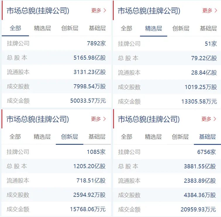新三板挂牌公司总计7892家(精选层51家,创新层1085家,基础层6756家),总股本5168.98亿股,流通股本3132.23亿股。