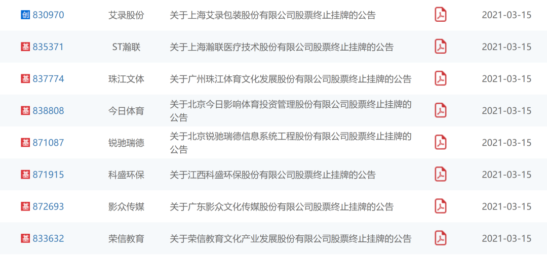 另据国中小企业股份转让系统官网显示,创新层公司艾录股份,基础层ST瀚联、珠江文体等8家公司3月15日公告,3月16日起终止在新三板挂牌。