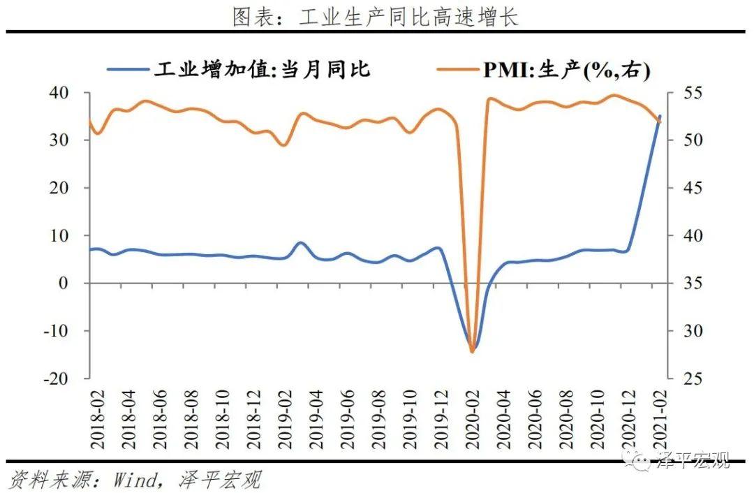 供给侧,工业生产高增长,强于需求端。受出口高景气带动,1-2月规模以上工业增加值同比增长35.1%,较2019年同期增长16.9%,两年平均增长8.1%,处于近年来较高增速水平;2月规模以上工业增加值环比增长0.69%。1-2月份,全国服务业生产指数同比增长31.1%,比2019年1-2月份增长14.1%,两年平均增长6.8%。