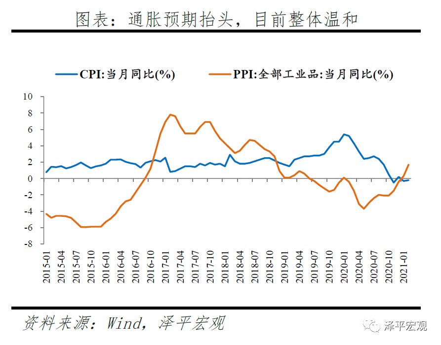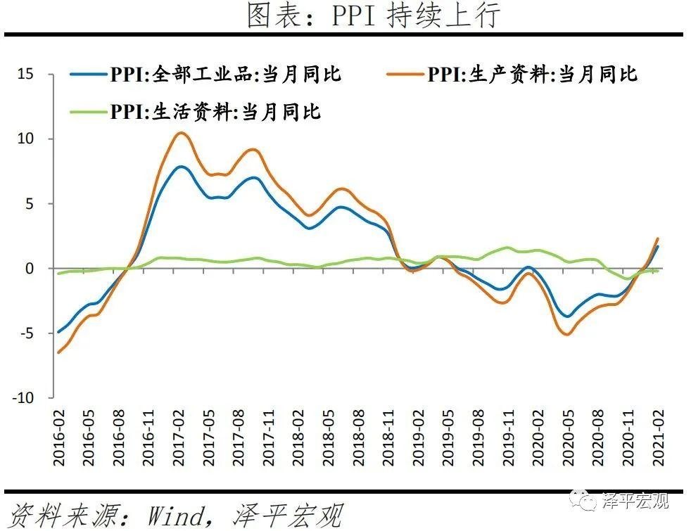 2月PPI同比上涨1.7%,较上月上涨1.4个百分点;环比上涨0.8%,较上月下降0.2个百分点。PPI上行主因工业生产持续向好,出口和投资恢复,以及国际大宗商品价格拉动。2月布伦特原油均价环比13.3%,南华工业品指数环比4.8%,南华螺纹钢环比1.9%,LME铜环比4.7%。分行业看,涨幅较大的主要是煤炭、石油、化工、有色和黑色金属。受国际原油价格上涨等因素影响,相关行业涨幅均有所扩大;其中,石油和天然气开采业价格涨7.5%,石油、煤炭及其他燃料加工业价格上涨4.9%,化学原料和化学制品制造业价格上涨2.1%,涨幅分别扩大1.1个百分点。金属相关行业价格继续上涨,合计影响PPI上涨约0.24个百分点;其中,黑色金属矿采选业价格上涨5.9%,有色金属冶炼和压延加工业价格上涨1.5%,黑色金属冶炼和压延加工业价格上涨2.3%。
